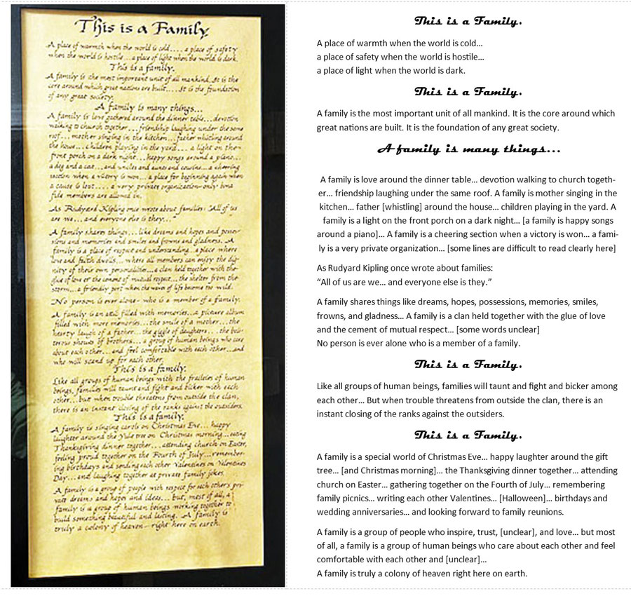 “This is a Family” above, is something our father gave to each of his 7 children, and it is so true, I still have mine hanging on the wall. As mad as we could get at one another, there is “NO” doubt that all of us would stick up for each other!
